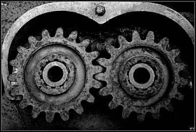 Als um die Mittagszeit ein Pfiff ertönte, löste sich dieses Teil von der Maschine und verließ die Halle, während die Maschine hilflos stehenblieb, zwiefach : in sich und am Ort. Plötzlich erwies sich, das billigste Teil und das am schlimmsten vernachlässigte war das teuerste und nur scheinbar ersetzlich. Wo es kaputtgeht, wird es nicht lange dauern, bis über den Beton Gras gewachsen ist.
