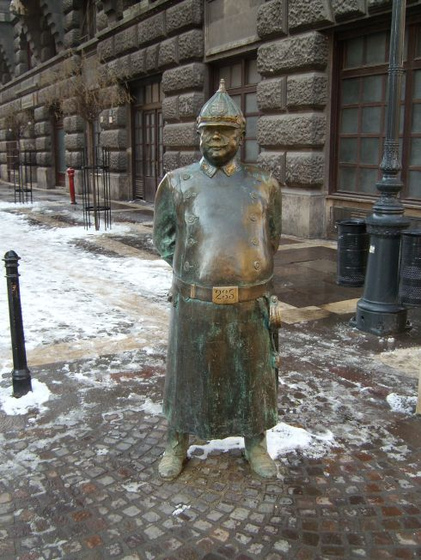 PS : La foton faris kantistino Anjo, kiu fotis ĝin en Hungario. Do en la iama regno de la habsburka monarkio. La policano estas evidente ekzemplero el tiu tempo. La spirito de tiaj uloj ankoraŭ nun vivas. La nuna registaro en Hungario ne povus nei certan parencecon al la skulptura figuro. Tial ii ŝajne ankaŭ pagis la monumenton. La policŝtato denove estas "en modo". Kaj tio ne estas miraklo. Ju pli da polico registaro de ŝtato bezonas, des malpli ĝi estas efektive la reprezentanto de ties popolo. Des pli da policbastonoj necesas por teni la popolon surgenue. (HGK)