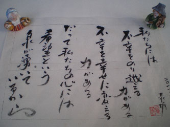 Hodiaŭ mi havis iom da libera tempo, do mi skribis du leterojn, unu al esperantistino en la gubernio Iŭate por kuraĝigi ŝin kaj unu al mia eksa studentino por gratuli ŝin pro ŝia edniziĝo. Mi skribis tiujn leterojn per peniko kaj tradicia inko, do mi profitis tiun okazon por kaligrafii kuraĝigajn vortojn. Mi sendis ĝin al kelkaj esperantistoj en Toohoku-regiono perrete.