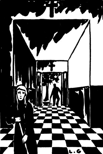 Je la sojlo de l’ vivo, en tiu konfuzanta aĝo kiun ŝi trairis, kion ŝi pensis ? Kion ŝi esperis ? Ĉu la Vivo ? Ĉu la Feliĉo ? Ĉirkaŭ si, la Morto agis ; ŝi nur vidis suferantojn. Pro kio vivi kiam oni devas finiĝi sur tablo aŭ lito hospitala ? Kiam ne estis monaĥino en la ĉambroj, ŝi parolis al la malsanuloj. Ĉi tiuj plendis sin kaj ankaŭ ŝin. Iafoje, ili donis al ŝi kelkajn bombonojn. Ĝene ŝi dankis.