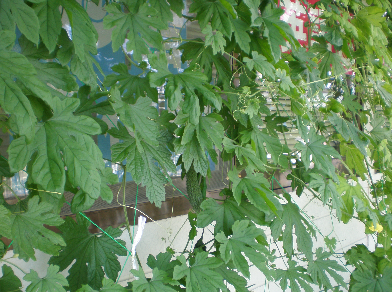 Japana somero estas netolereble varma. Kiamaniere oni povas vivi en tia somero, ne uzante aŭ malmulte uzante klimatizilon ? Tiam helpas tiu planto. Vidu, ĝi kovras la fenestron kiel verda kurteno. Samtempe ĝi donas al ni kukumojn. Tiamaniere sen klimatizilo, oni povas malvarmigi ĉambrojn. Ankaŭ tiu najbaro vartas momerdikojn, kaj antaŭhieraŭ la edzino donis al ni kelkajn kukumojn. Eble en la venonta jaro la fenestroj de tiu ĉi domo estos kovritaj per tiuj volvotiĝaj plantoj.