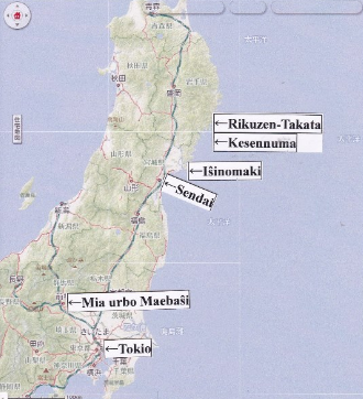 La 29an de aŭgusto mi vizitis la urbon Iŝinomaki, kiu estis la plej granda fiŝhaveno en Toohoku kaj plej damaĝita urbo kun 2978 mortinoj kaj 666 malaperintoj (fine de oktobro 2011). Kiam mi supreniris al la monto Hijori 50 metrojn alta, por rigardi la tutan urbon, mi renkontis unu viron. Li estis suferanto de la cunamo. Ofte troviĝas tiaj homoj sur la monteto, volante rakonti pri la katastrofo al turistoj.