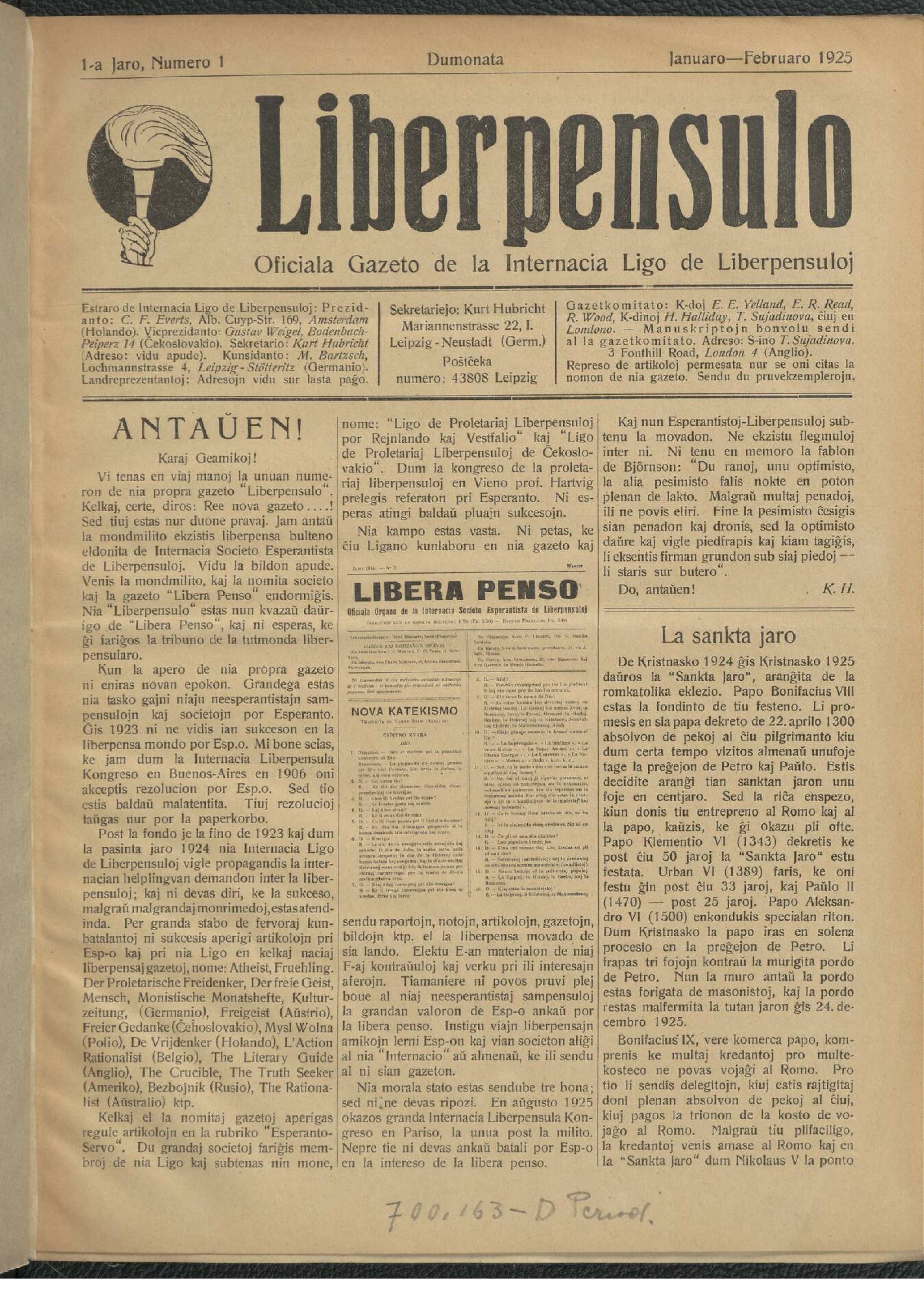 En 1925 (majo, #242) : Freethought. We have received the first number of the revived LiberPensulo. Specimen for 3d. from Mrs.