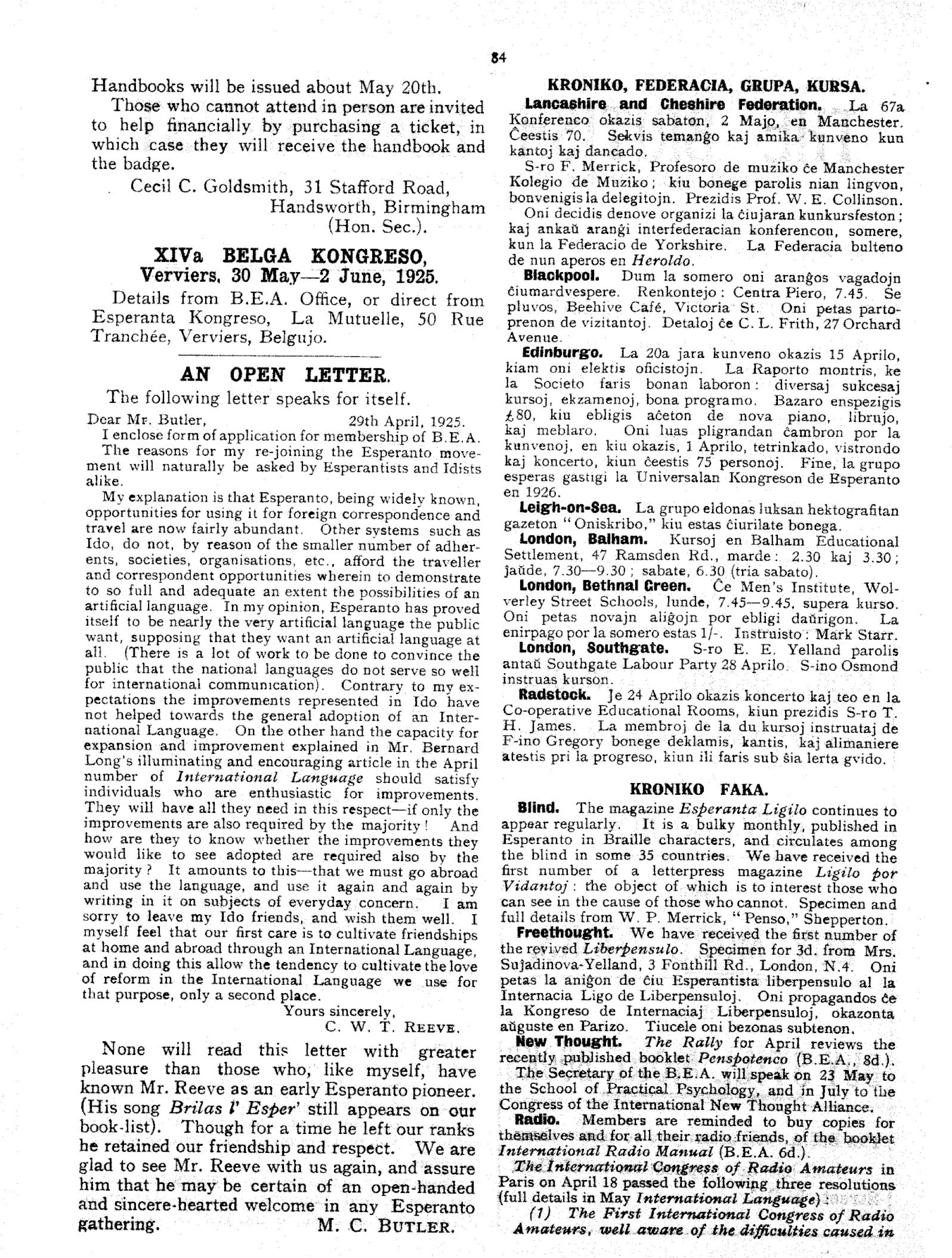 En la sama numero : London, Southgate. S-ro E. E. Yelland parolis antaŭ Southgate Labour Party 28 Aprilo. S-ino Osmond instruas kurson.