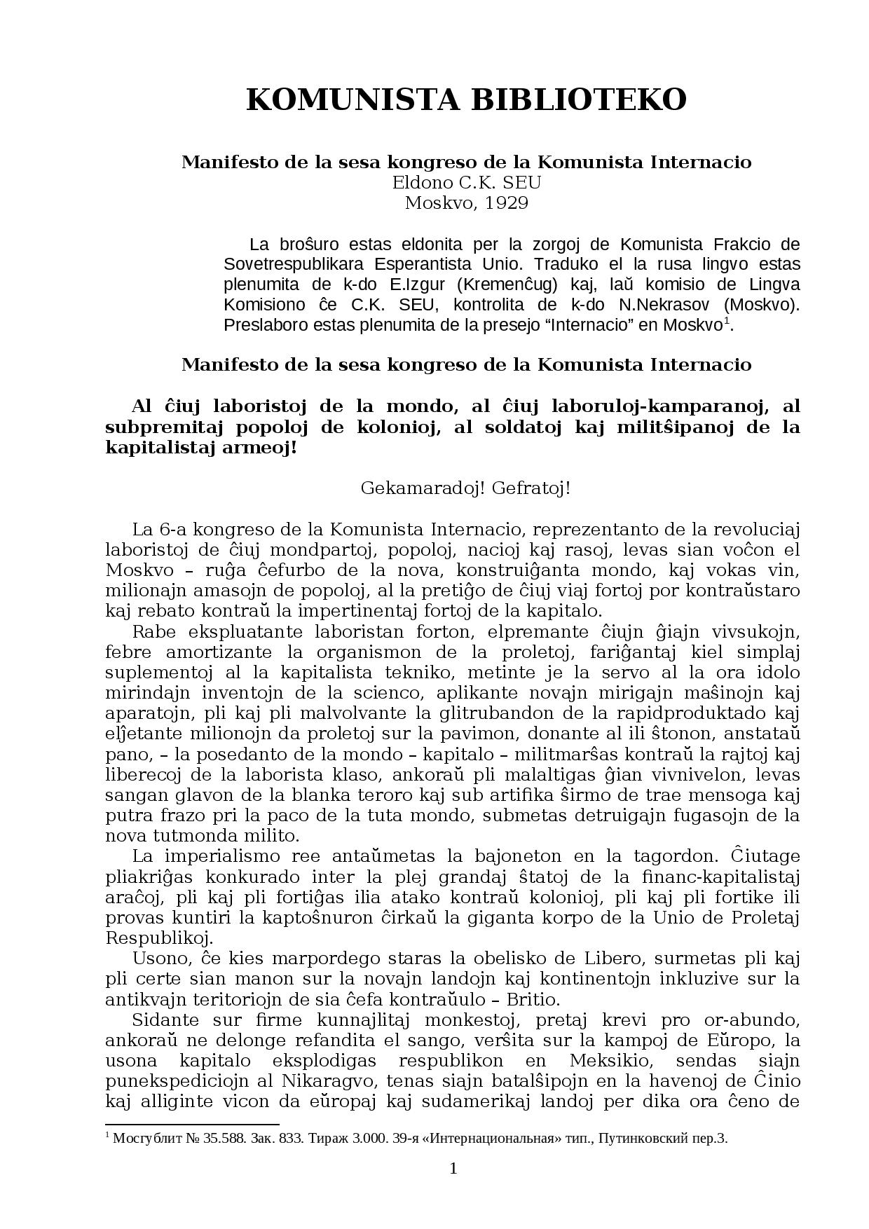 Manifesto de la sesa kongreso de la Komunista Internacia