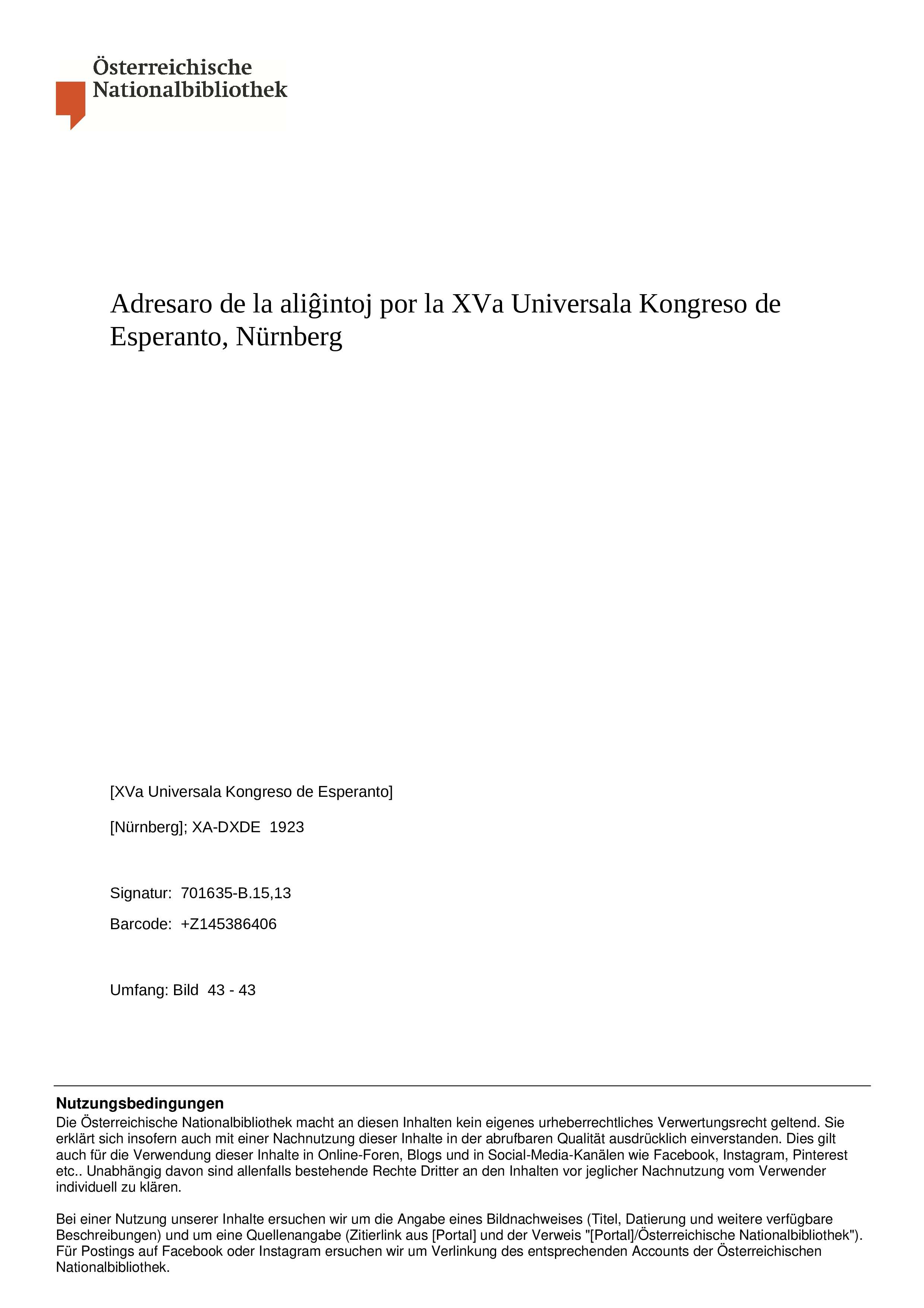 Bericht über den XV. intern. Esperanto Kongreß in Nürnberg, 2. bis 8. August 1923 (Wien 1924)
