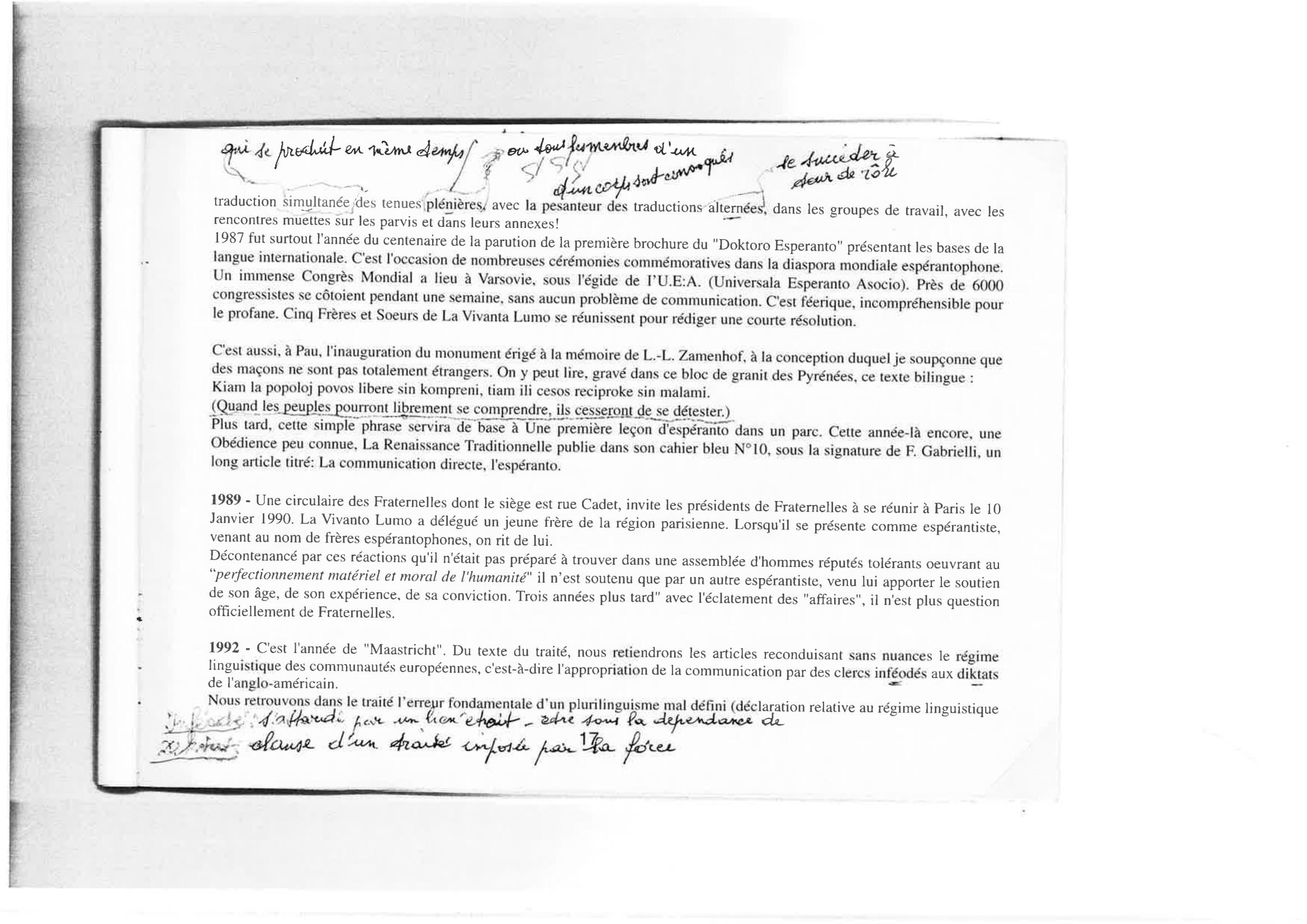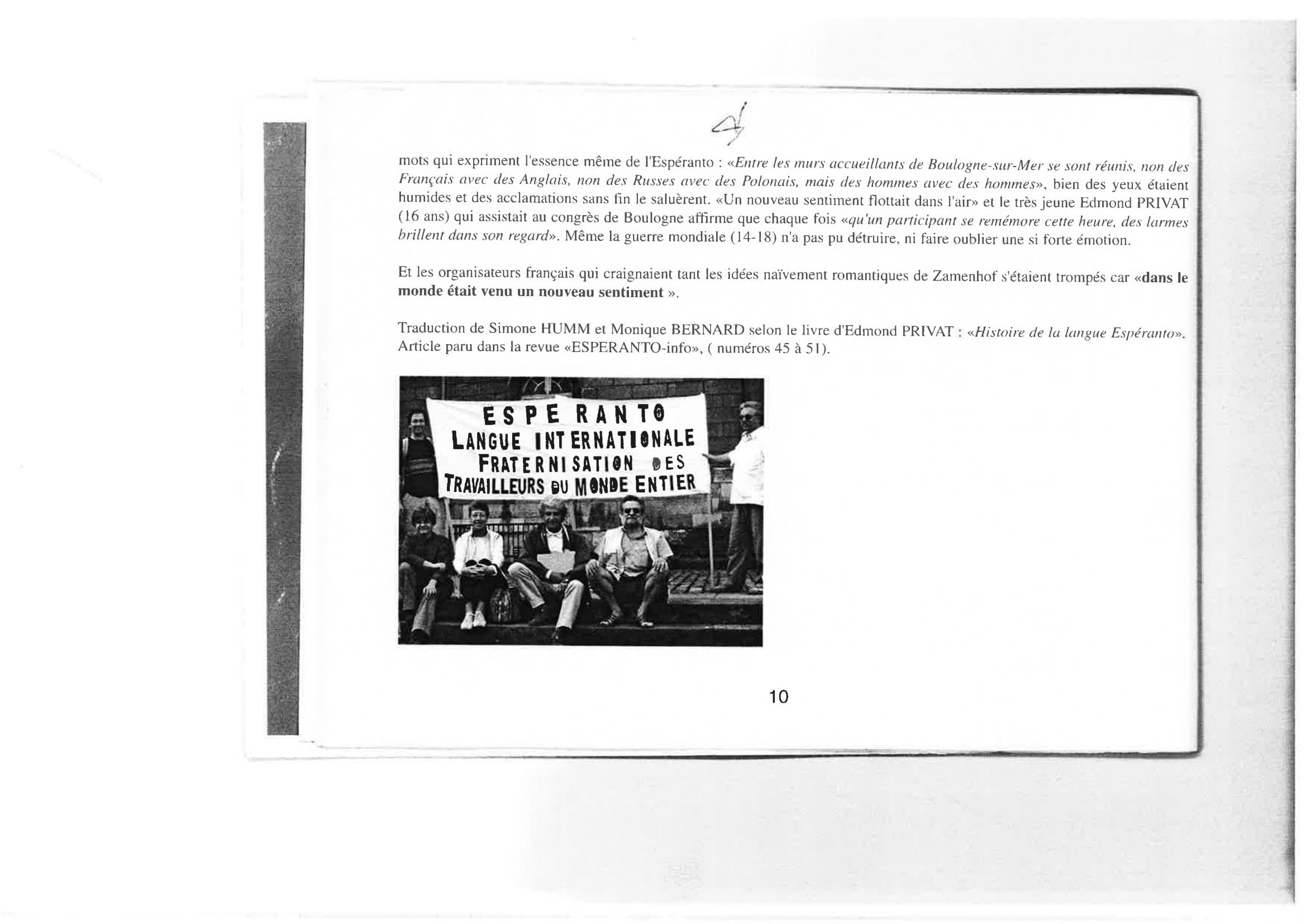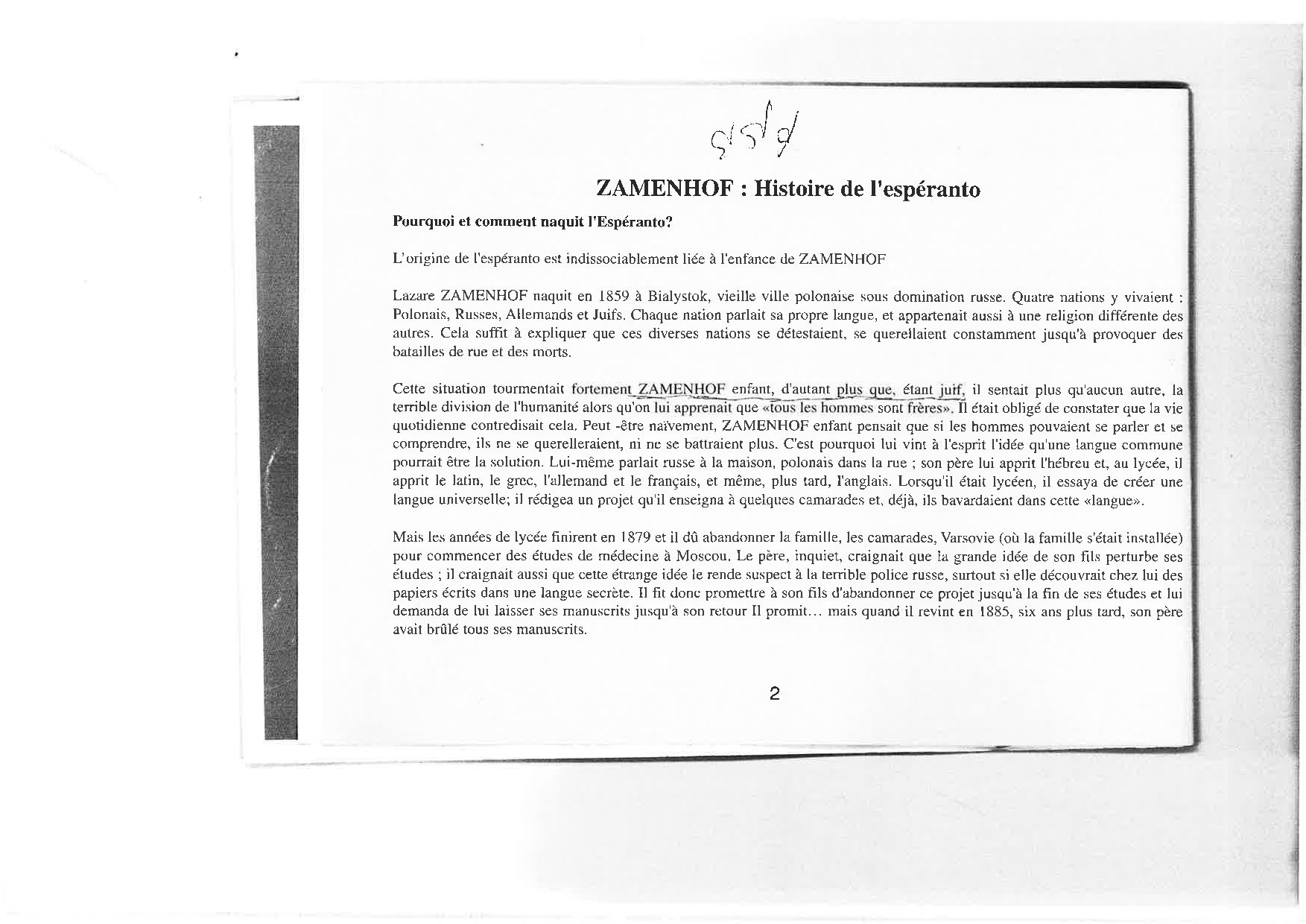 L’espéranto est une des nombreuses langues aŭxiliaires internationales ou universelles élaborées pour remédier aŭ difficultés de communication entre les hommes causées par la multiplicité d es langues. Il est élaboré en 1887 par Lazare-Louis Zamenhof (1859 1917), médecin juif polonais qui crée aussi une sorte de religion humanitariste, le hillélisme. L’espéranto l’emporte sur les autres langues aŭiliaires grâce à la simplicité de ses structures, à la facilité de son apprentissage, et à la souplesse de son fonctionnement. Il repose sur le respect de 16 règles qui ne souffrent aucune exception. Les mots sont formés à partir de radicaŭ latins et germaniques aŭquels s’ajoutent des préfixes et des suffixes ayant toujours la même signification ; ses conjugaisons ne comprennent aucune irrégularité, son écriture est phonétique, la prononciation homogène grâce à un accent tonique toujours placé sur l’avant-dernière syllabe.