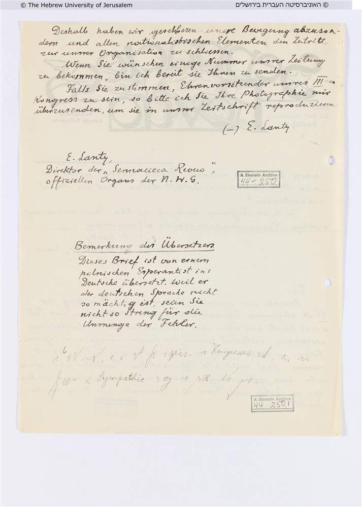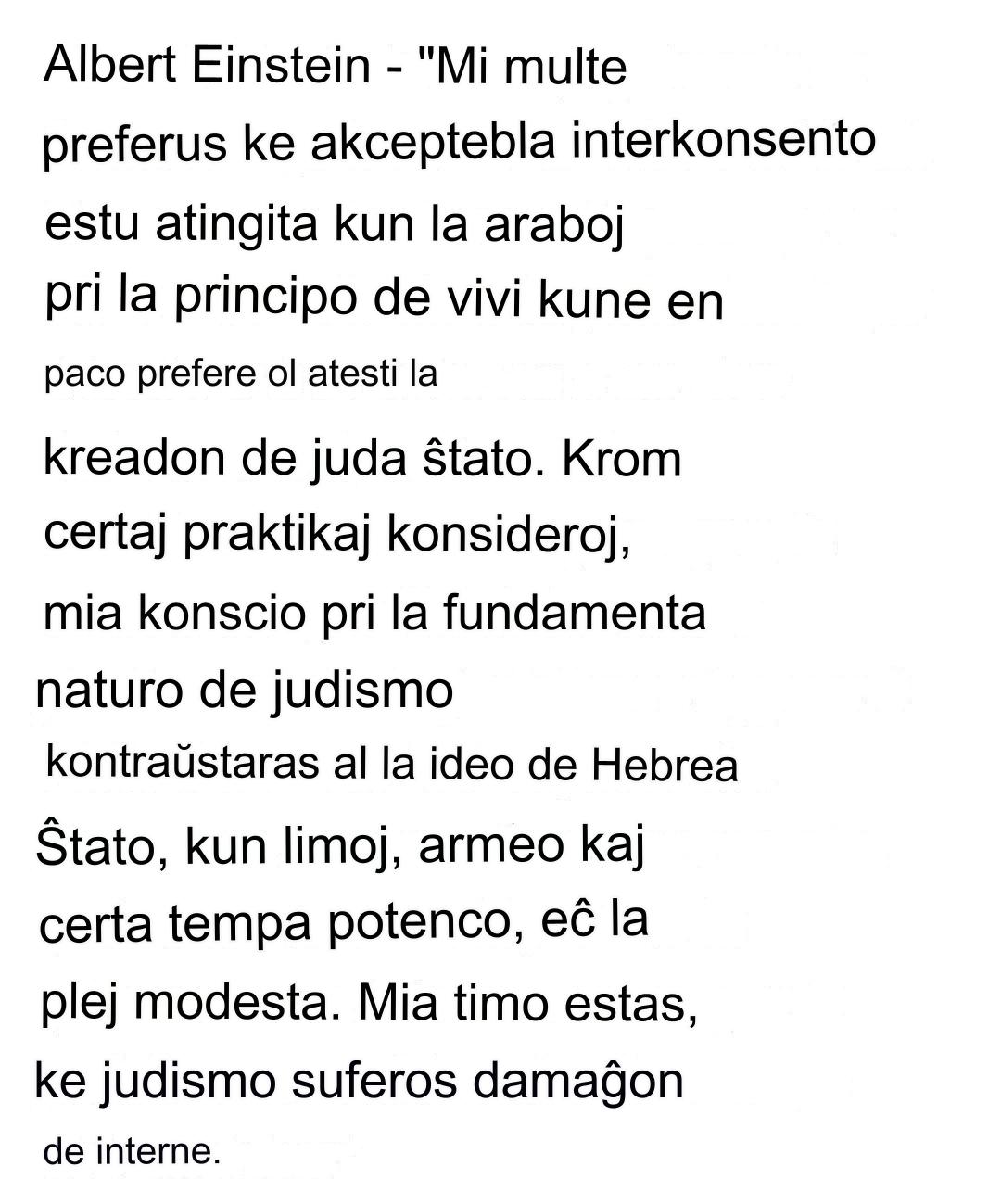 "Estus, laŭ mi, pli racie atingi interkonsenton kun la araboj surbaze de paca komuna vivo ol krei judan ŝtaton... Mia konscio pri la esenca naturo de judismo kolizias kun la ideo de Juda ŝtato kun landlimoj, armeo kaj plano por tempa povo, kiom ajn modesta ĝi estu.Mi timas la internan damaĝon, kiun suferos judismo pro la evoluo, ene de niaj vicoj, de mallarĝa naciismo... Ni ne plu estas la Judoj de la periodo de la Makabeoj. Refariĝi nacio, en la politika signifo de la vorto, estus ekvivalento al deturni sin de la spiritigo de nia komunumo, kiun ni ŝuldas al la genio de niaj profetoj." Citita de Moshe Menuhin, La dekadenco de judismo en nia tempo, 1969, p. 324.