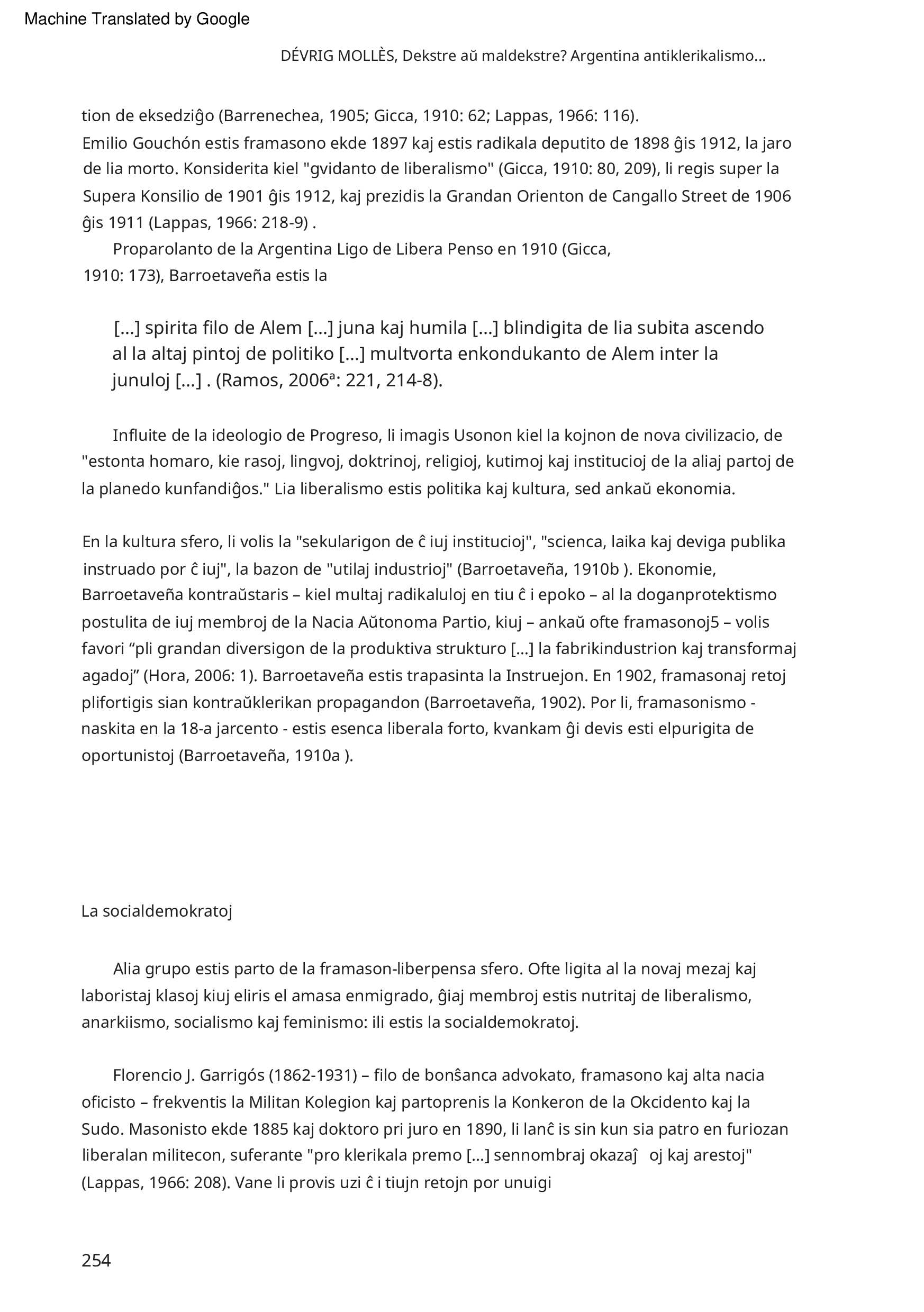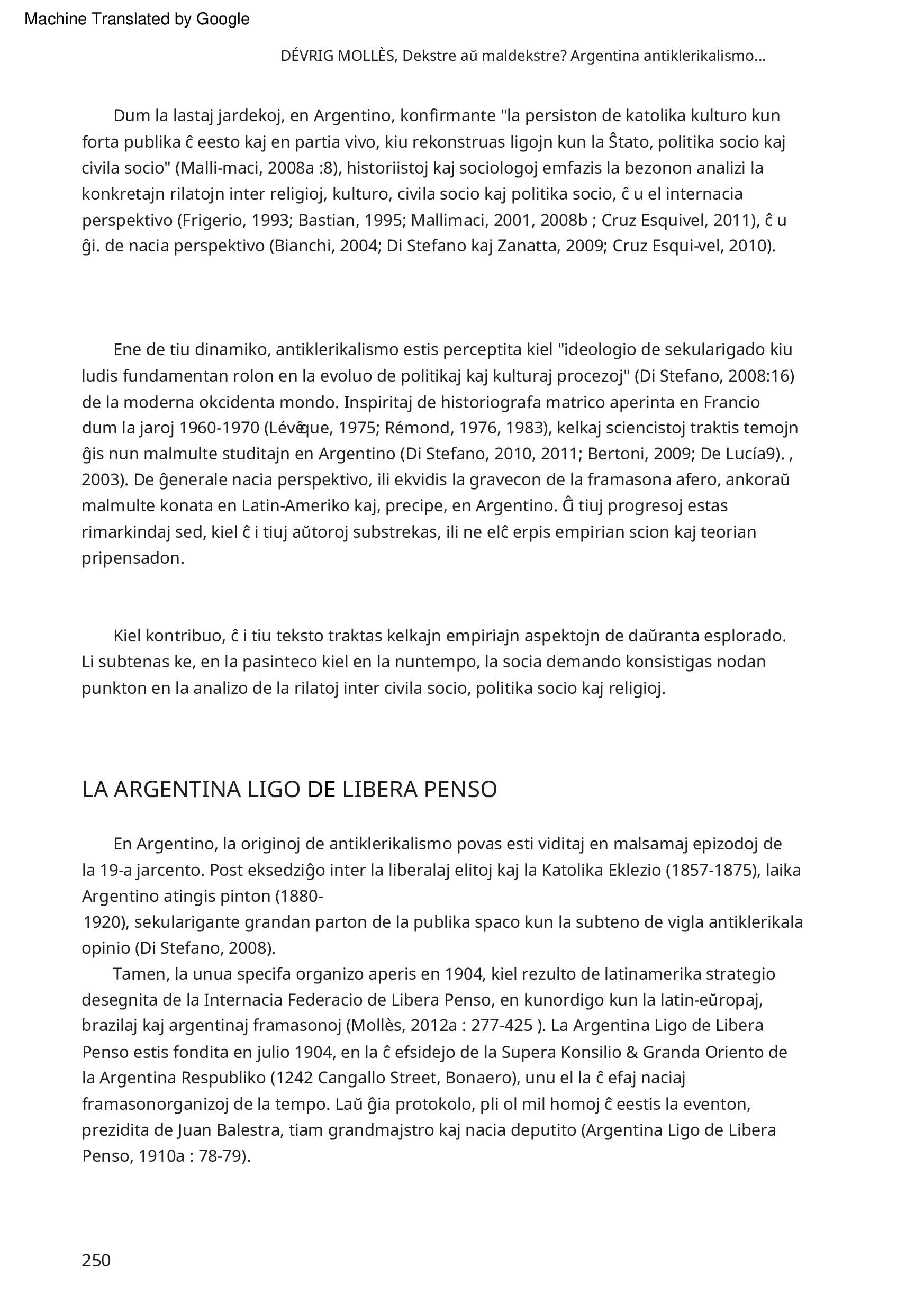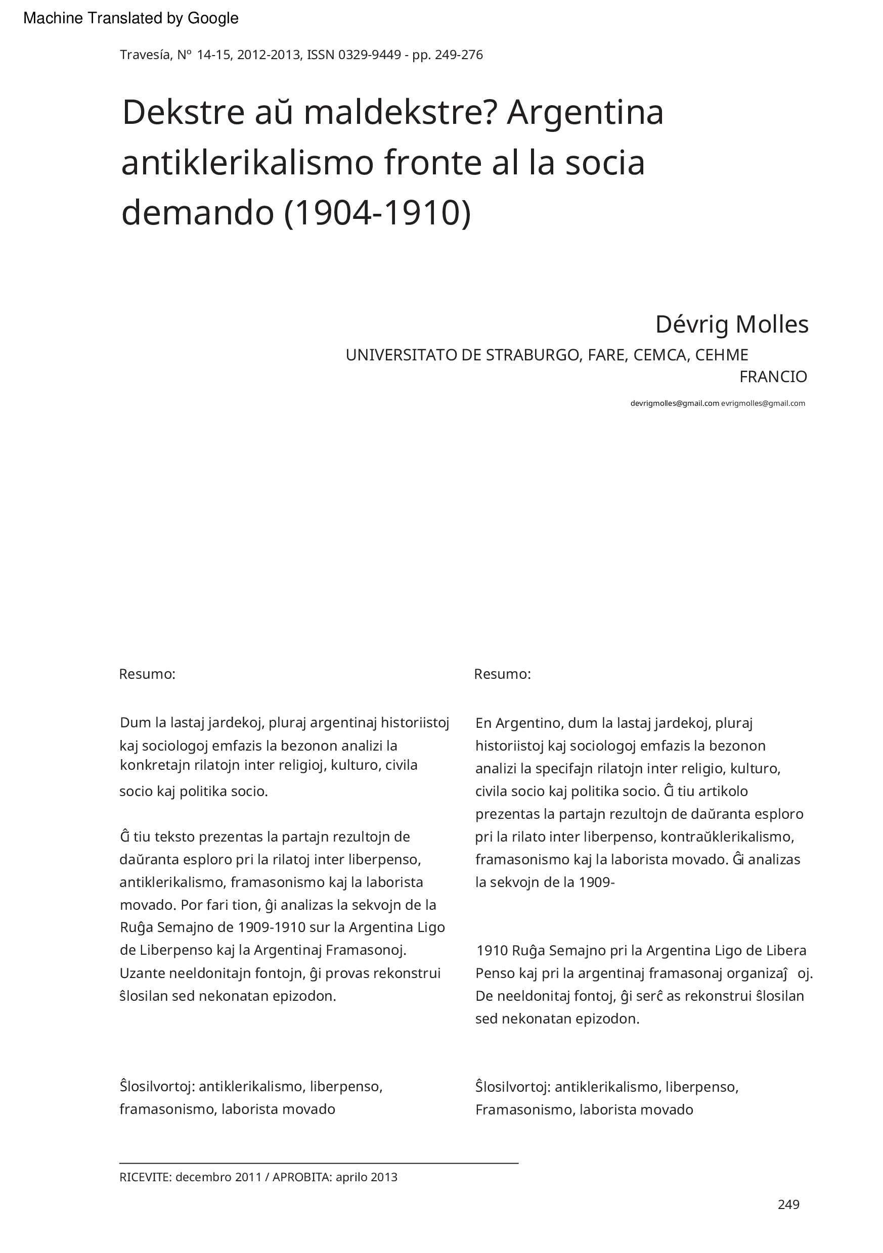 Dekstre aŭ maldekstre ? Argentina antiklerikalismo fronte al la socia demando (1904-1910) Dévrig Molles